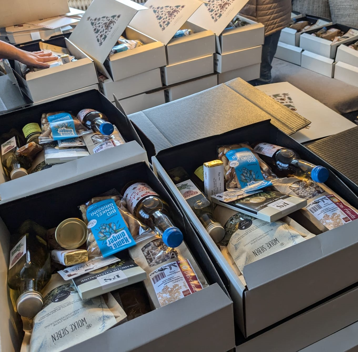 Man kann sich aber im neuen Hofladen individuelle Geschenkboxen, -kartons oder -taschen aussuchen und befüllen lassen. - Almer Hofladen -