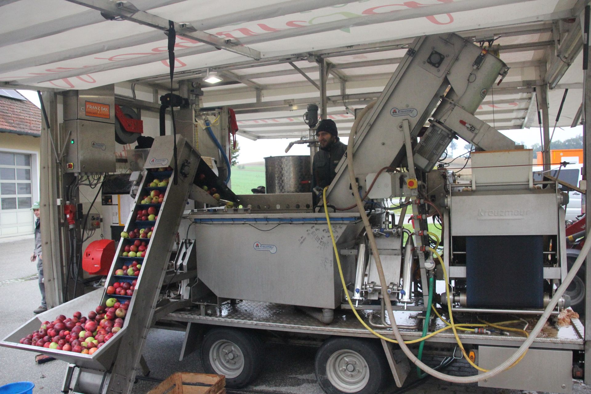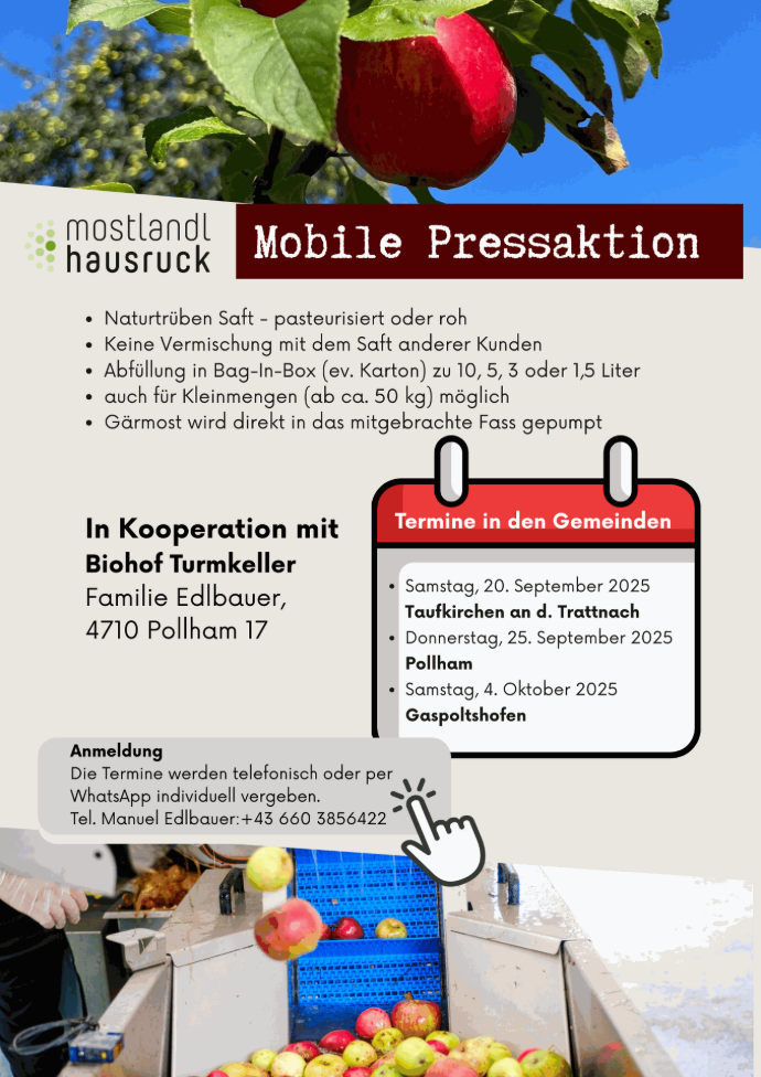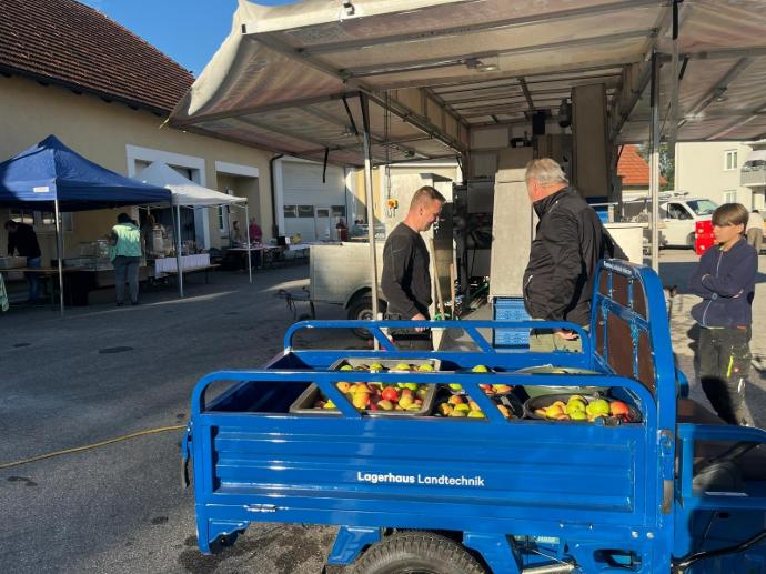 Einmal im Jahr macht eine mobile Obstpresse in Gemeinden der Region halt und bietet die Möglichkeit ganz unkompliziert sein eigenes Obst zu Saft oder Gärmost verarbeiten zu lassen. Abgefüllt in Bag-In-Boxen oder in das mitgebrachte Fass kann der Saft/Most sofort mit nach Hause genommen werden.